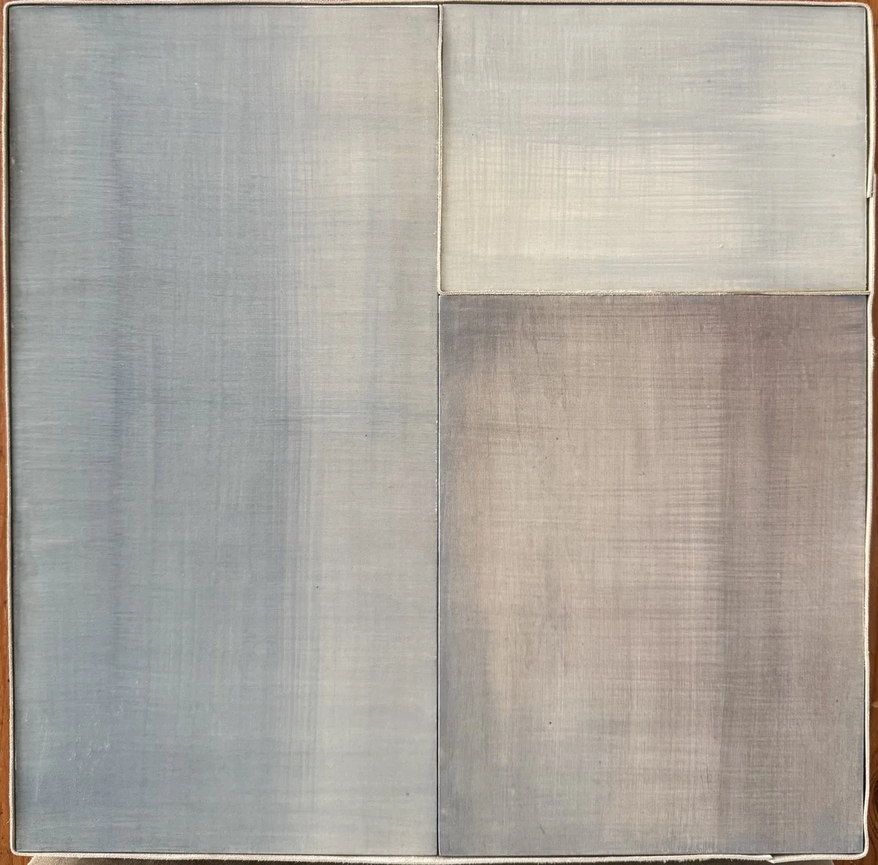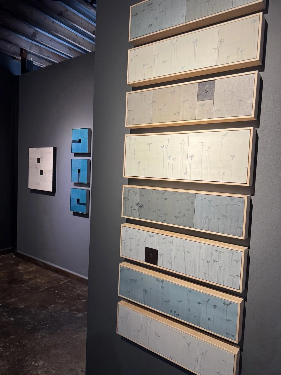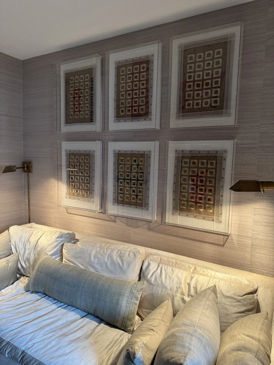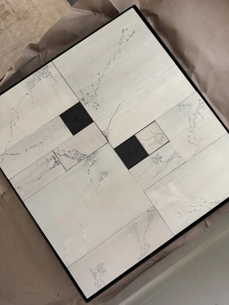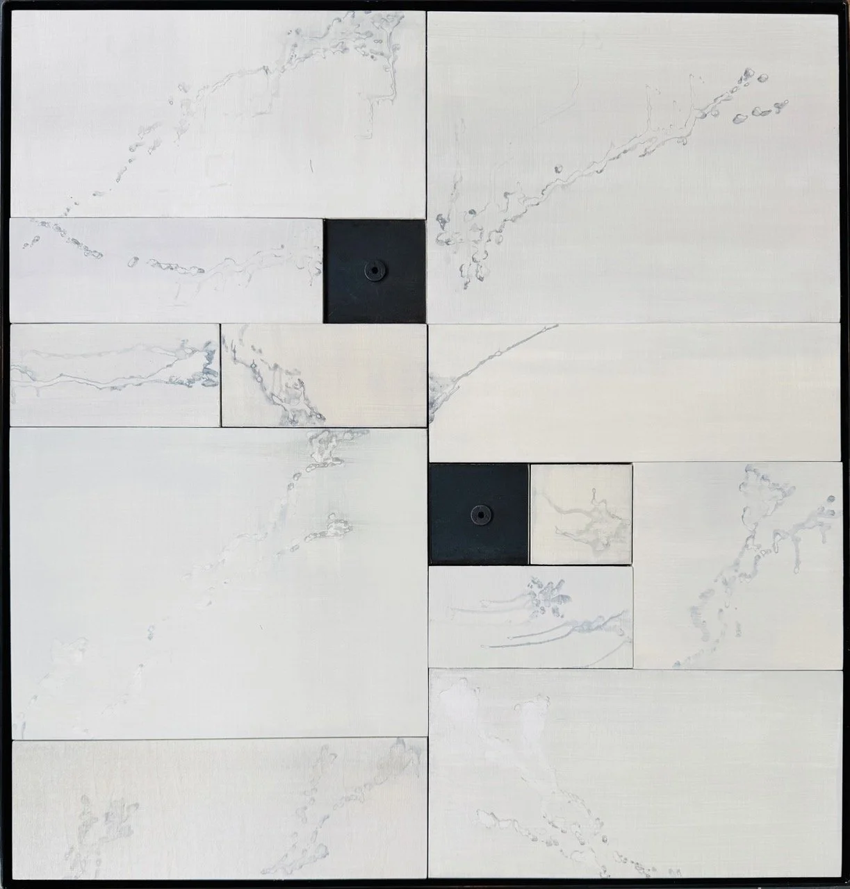 'Current' 2023 Acrylic glazed wood birch panels framed in vintage leather and contained in steel grid frame with brass corners  SOLD View fullsize