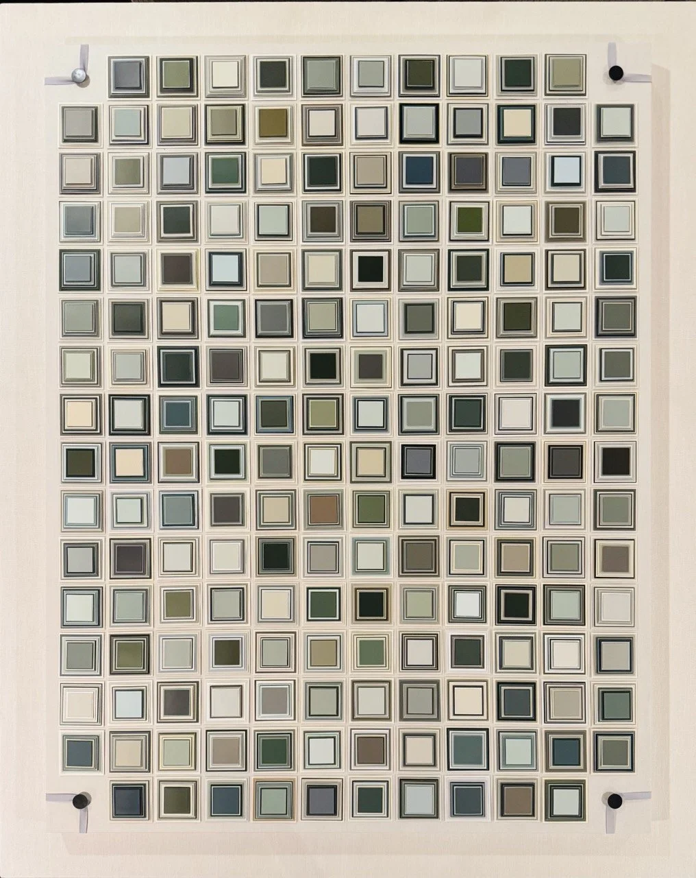 Obstinate - Painted paper and zinc tack layered over upholstered linen box.  Available through Davis Gallery