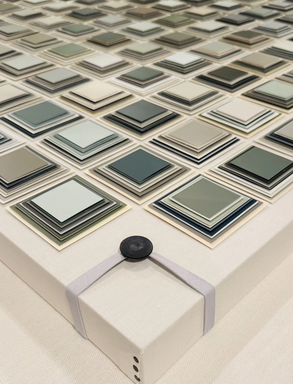 'Float' 2023 Painted paper layered over upholstered ground secured with leather and upholstery tack in acrylic box  SOLD View fullsize